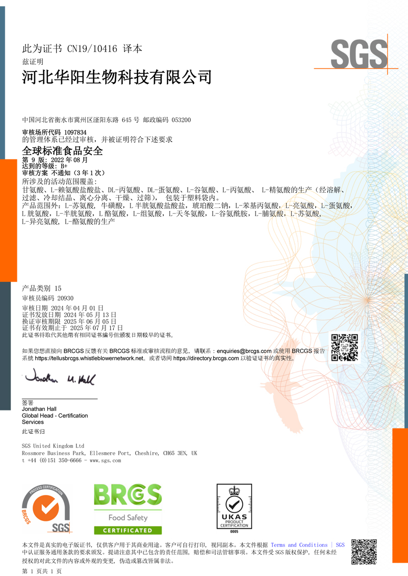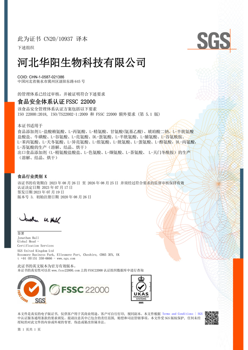 河北華陽集團坐落于河北省衡水市冀州區省級工業園區(始建于1987年,前身為冀州市華陽化工有限責任公司)。集團下屬四個公司:河北華陽生物科技有限公司、河北華悅氨基酸科技有限公司、滄州華晨生物科技有限公司、衡水市陽力商貿有限公司。主要生產甘氨酸、L-丙氨酸、L-蘇氨酸、DL-蛋氨酸、L-賴氨酸鹽酸鹽、L-半胱氨酸鹽酸鹽、干貝素等氨基酸系列食品級產品,廣泛應用于食品、飲料、飼料等行業。......